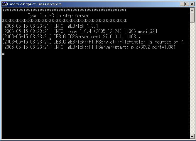 パッケージを解凍すると lazylines というフォルダが出てきます。 その中の、server.exe をダブルクリックして実行してください。 以下のような黒いウィンドウ (コマンドプロンプト) が出てきます。