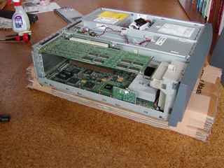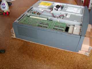 64bit PCI に刺さってるビデオカードとドライブ類を全部抜いた状態の写真が下段。 側面カバーは両側とも外れる。