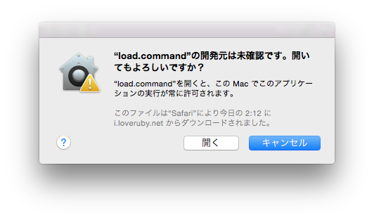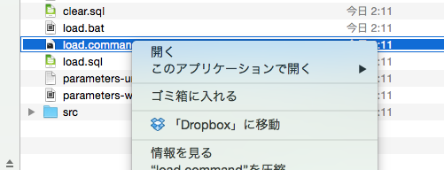 「stdsql-日付」フォルダの中の、 load.commandファイルをcontrolボタンを押しながらクリックし、 メニューから「開く」を選んで実行してください(下図)。 ダブルクリックではダメです。