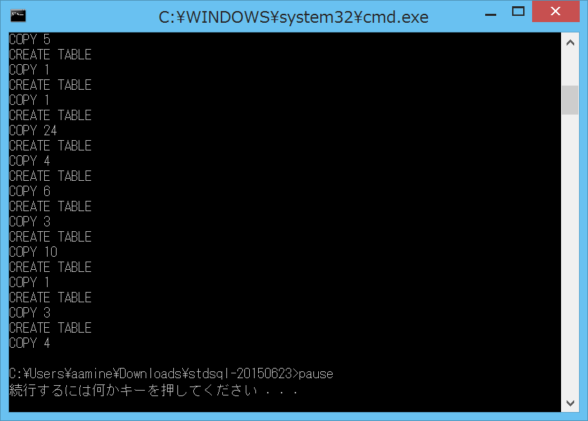 以上でロード処理が実行されます。 次のように「続行するには何かキーを押してください……」と表示されたら処理は正常に終了しているので、 ウィンドウを閉じて構いません。